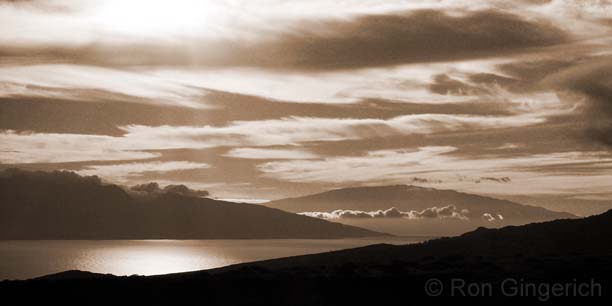 West Maui, Haleakala in a lei of clouds, and the Au`au channel seen from the Mahana area of Lana`i