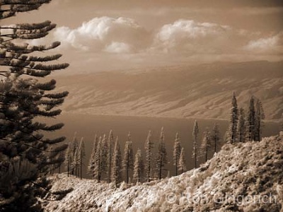 The Cook Island Pines on Lana`i Hale, with Moloka`i across the channel